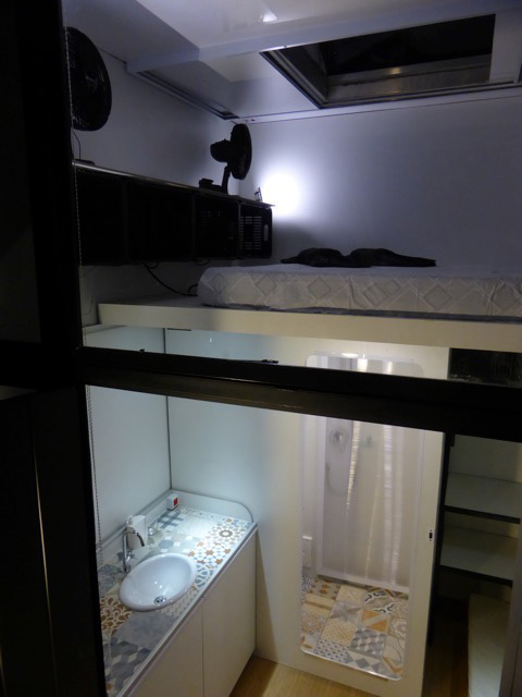 O mezanino é também equipado com um grande aparador suspenso onde ha apoio para TV, luminária e livros, além de nichos para roupas, sapatos e outros objetos. Uma grande claraboia transparente instalada no teto, com dimensões de 1m x 1m, deixa a Casa-Cubo “respirar” ar puro e aproveitar a luz externa. Além de ajudar na economia de energia (iluminação/ventilação refrigeração). A claraboia também permite se dormir com vista para um espetacular de um céu estrelado, e quando aberta possibilita que os ocupantes não só fiquem em pé no mezanino, como também acessem o teto que serve como deck.